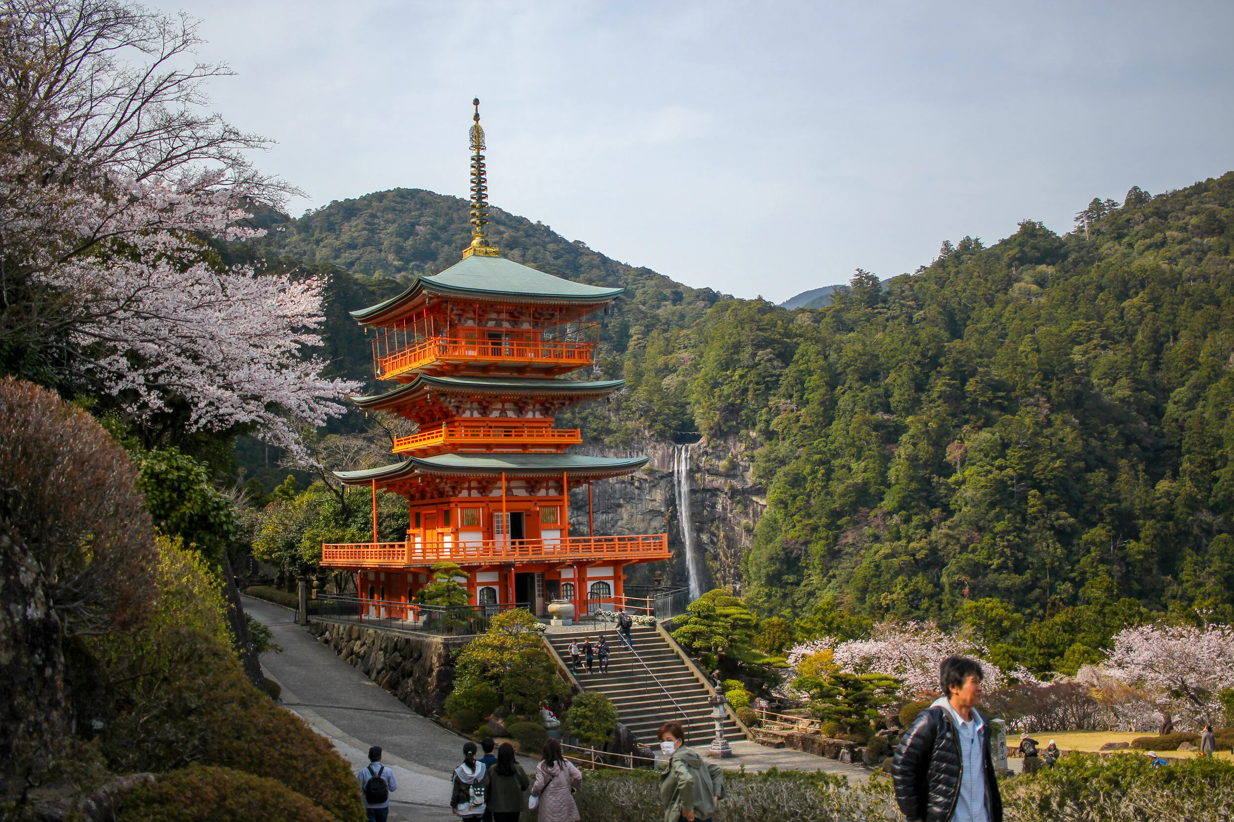 Nachisan is a mountain town where Buddhism and Shintoism have co-existed in harmony for centuries. This is your final destination. Kumano Nachi Taisha is one of Kumano’s three grand shrines, and is located beside Nachi Falls, the tallest waterfall in Japan with a vertical drop of 133 metres. The breathtaking waterfall is said to be the home of a Shinto deity, and can be viewed in all its splendour from the observation platform near Seigantoji Temple. The shrine’s iconic three-tiered pagoda stands proudly nearby, adding to the marvellous scenery.